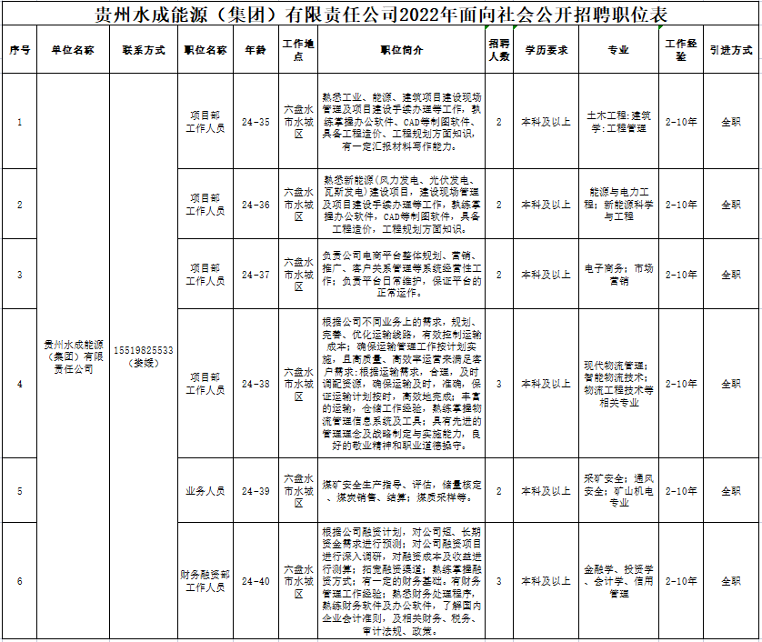 我公司业务发展需要,现通过第十届贵州人才博览会面向社会公开招聘项目部工作人员9名,业务工作人员2名,财务融资部工作人员3名,薪酬待遇按照公司薪酬管理办法执行,具体报名可通过以下方式进行投递: