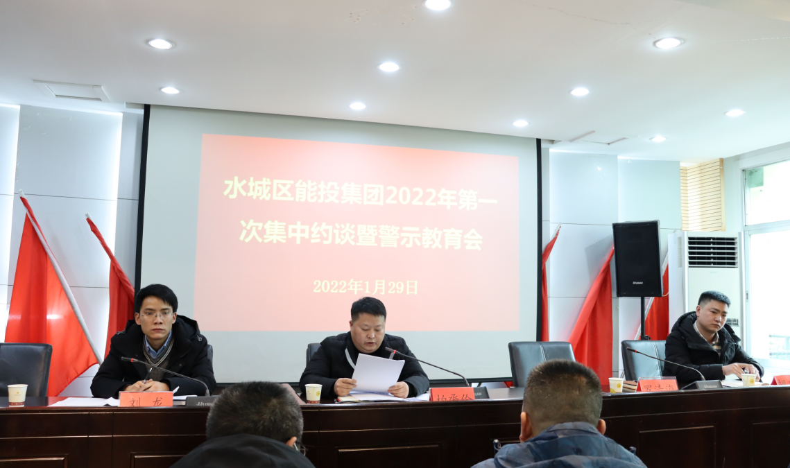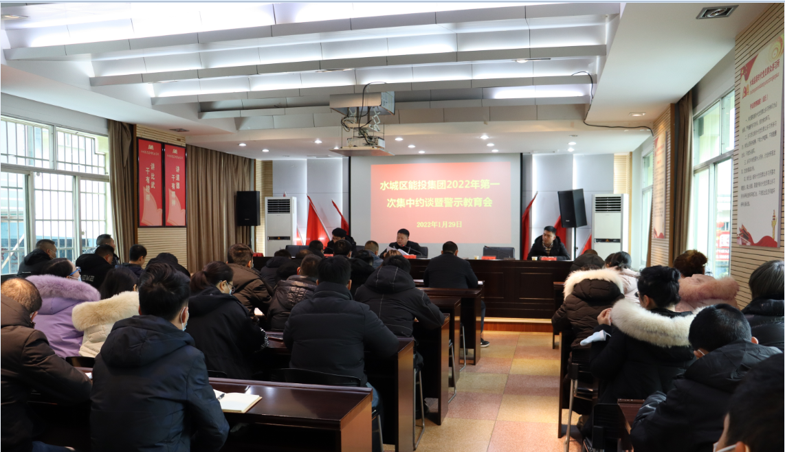 2022年1月29日,六盘水市水城区能投实业(集团)有限公司结合虎年春节来临及2022年新年伊始之际,组织全体干部职工在区工信局二楼会议室开展警示教育暨集中约谈会,会议由能投公司副总经理刘龙主持,公司党委委员、纪委书记柏卺伶对全体干部职工进行警示教育、集中约谈,再次敲响廉政警钟、筑牢干部职工廉政思想。